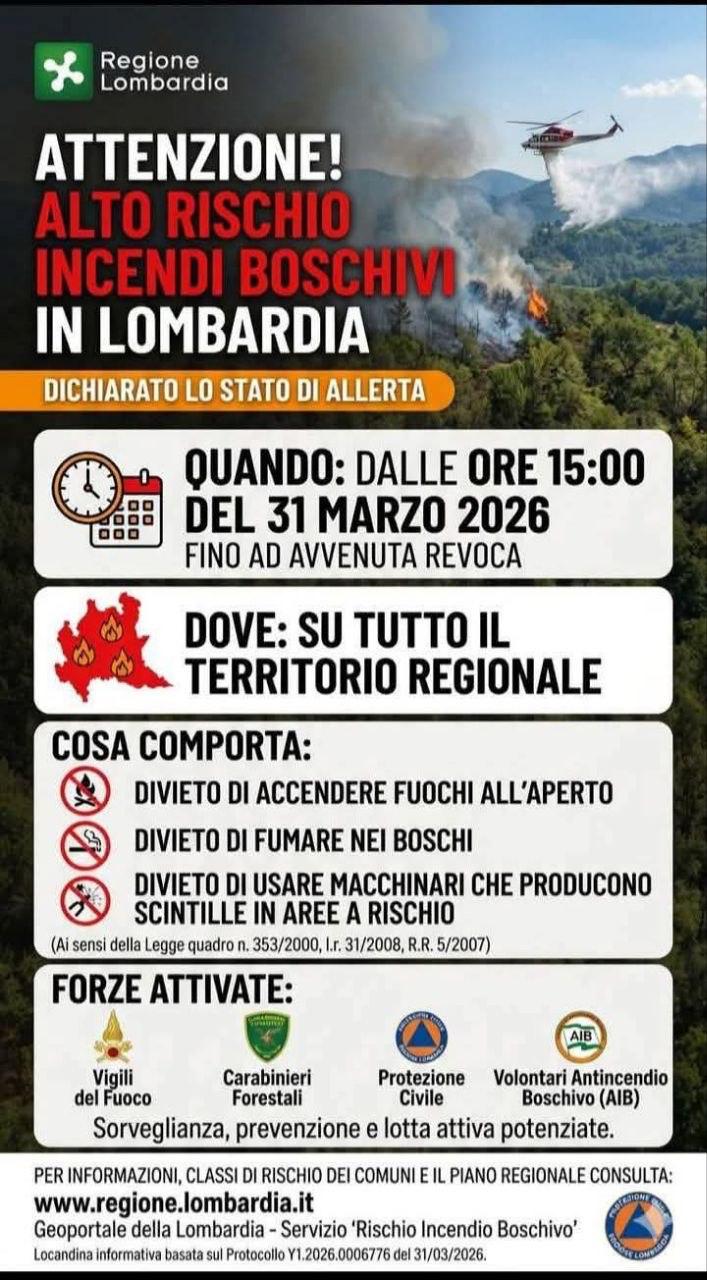 Il Comune di Castenedolo informa che Regione Lombardia ha dichiarato lo stato di alto rischio incendi boschivi su tutto il territorio regionale.